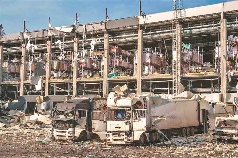 烏克蘭首都基輔一處物流中心,25日因俄羅斯空襲受損。圖/美聯社