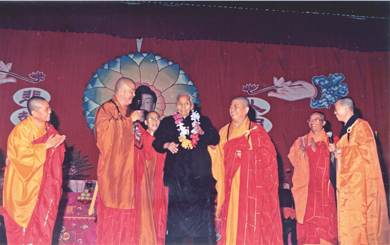 1990年,星雲大師的母親(右4)來到台灣佛光山,在兩萬人的信徒大會上,大家熱烈地對著他高呼:「老奶奶好。」老奶奶說:「大家對我這麼好,我沒有東西給你們,我只有把我的兒子送給大家。」圖/佛光山提供