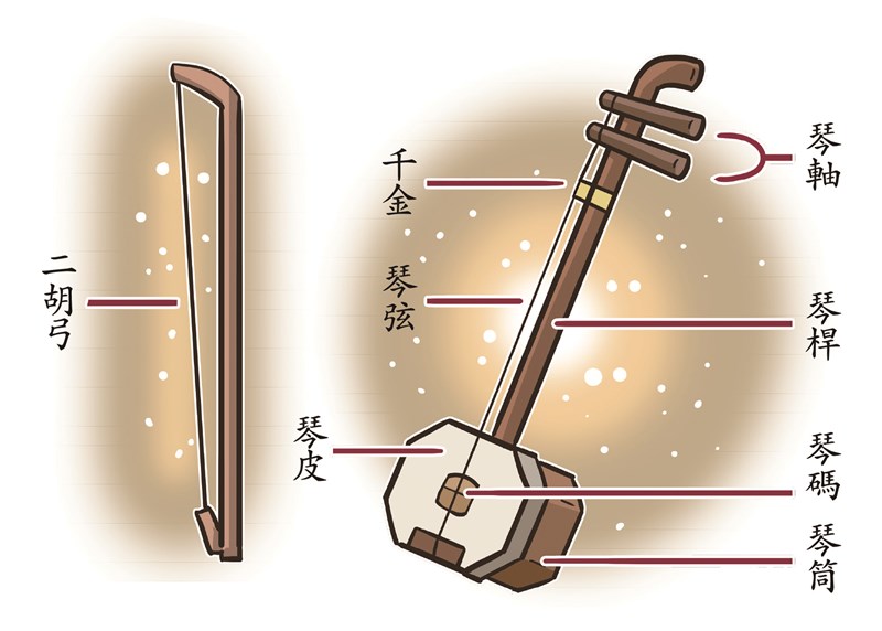 二胡有兩條琴弦,分為內弦與外弦。弦粗,外弦細,通過調節琴杆上的弦軸可以改變琴弦的音高。早期琴弦用蠶絲製作,現代二胡琴弦用鋼絲弦,音色更加明亮清晰且耐用。「弦與外弦的音高相差一個五度音程,通過手指在琴杆上按弦位置不同,演奏出不同音高。