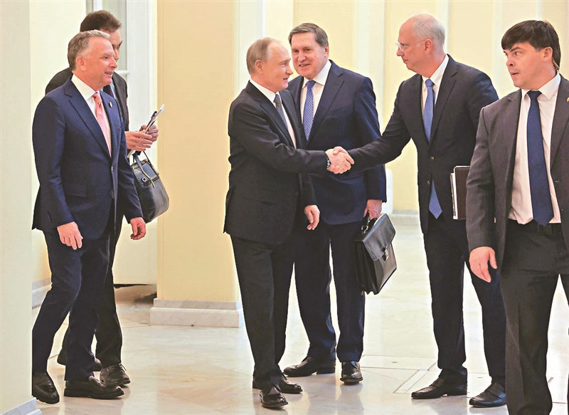 俄羅斯總統普亭(中)今年4月在聖彼得堡與他的特使德米崔耶夫(右2)握手,美國總統川普特使魏科夫(左1)則在一旁觀看。圖/美聯社