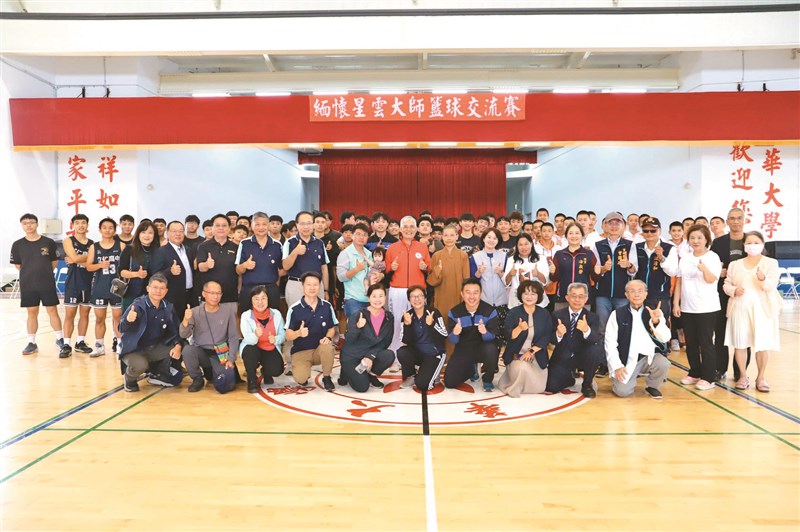 南華大學運動會舉辦「緬懷星雲大師籃球交流賽」,校長高俊雄(第2排右9)、覺禹法師(第2排右8)與眾貴賓合影。圖/南華大學提供