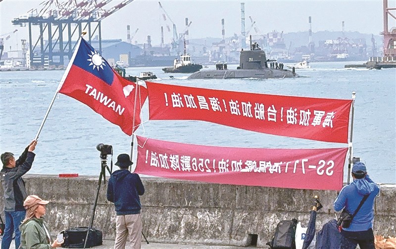 國造潛艦海鯤號昨出海執行第4次浮航測試(SAT),軍事迷一早就聚集在高雄港,拉著紅色布條加油打氣。圖/中央社