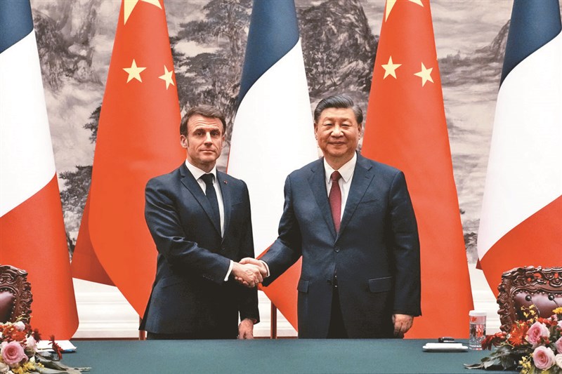 法國總統馬克宏(左)12月3日將對中國大陸進行為期3天的國是訪問。圖為馬克宏2023年4月在北京與習近平(右)會面。圖/美聯社