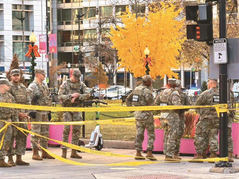 美國西維吉尼亞州二名國民兵二十六日在白宮附近遭槍擊重傷,事發後國民兵在現場進行蒐證。圖/法新社