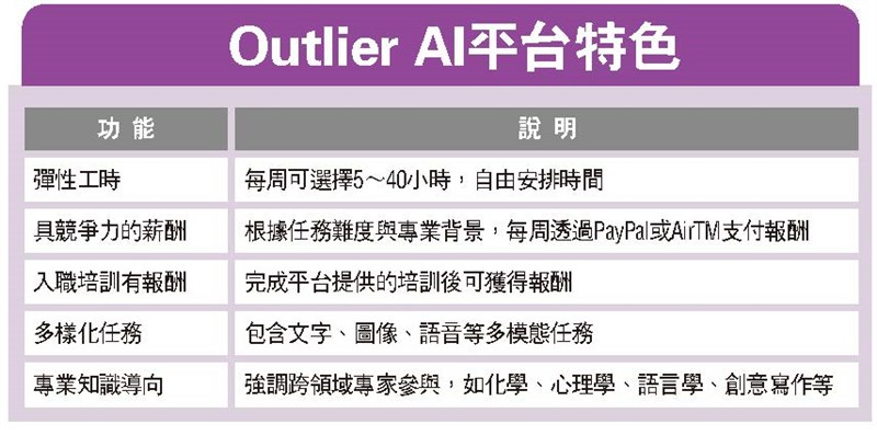 此平台專注於語言模型的優化,主要任務是評估AI回應的品質。通過平台測試後,時薪可達20美元以上,適合具備語言理解與分析能力者。Outlier AI是一個專門提供 AI 模型訓練與評估任務的平台,適合來自各領域的專業人士可以透過遠端方式參與人工智慧的發展,同時獲得報酬。