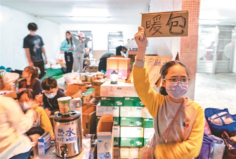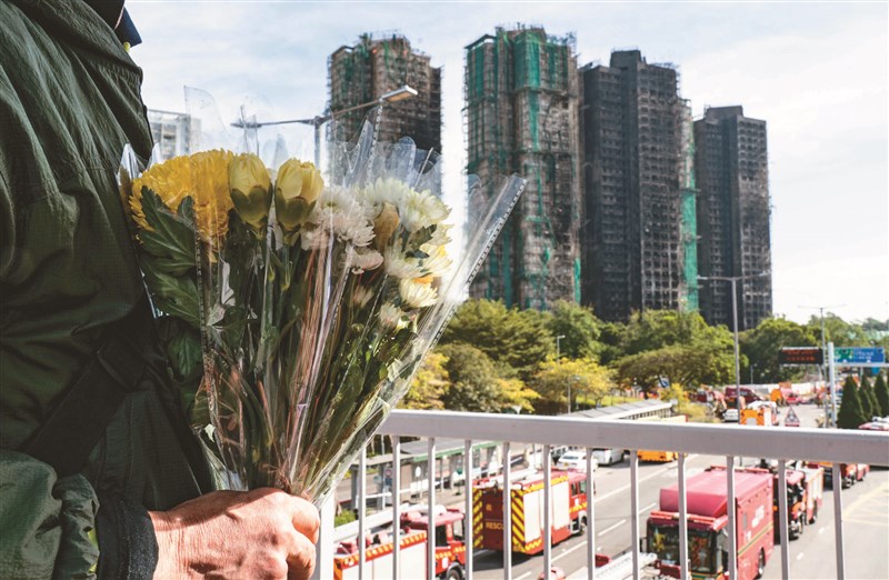 據28日最新統計,香港大埔宏福苑火災已有128人死亡,200人失聯;左圖為一位市民28日上午手捧花束,在現場附近表達哀思。上圖為27日晚在火災現場附近的廣福邨公眾活動平台,不少青少年參與為災民提供熱水、暖包等物資幫助。圖/中新社