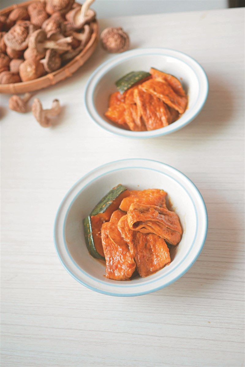 我最常把南瓜蒸熟撒些鹽,這樣吃原味;也常做紅燒南瓜豆包或豆皮,因為做法簡單,可當菜又可當主食,非常方便。偶爾到寺院大寮典座,有次信徒供養南瓜頗多,我就做了紅燒南瓜豆包供眾,結果大受好評。常常分享南瓜來的好鄰居說:平時其實並不喜歡南瓜料理,但吃過這道菜後,南瓜入菜就只吃這道紅燒南瓜豆包了!