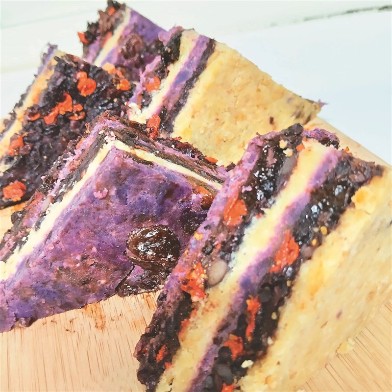 小米、綠豆蒜、薏仁,紅豆、黑米,紫薯或各式雜糧、甜薯隨意,清洗塵土削皮、濾除雜質後,浸泡發脹依黃白、紅黑、紫薯分類炊蒸熟軟壓成泥,黃白二色趁熱融入少許冰糖勾出香潤,紅黑則增添適量枸杞綴點豔橘,醇厚紫薯則灑落清爽微甜葡萄乾,待所有材料稍涼後,取一保鮮盒依序填裝餡料,層疊抹平鋪延、壓實冷藏定型,食用時依個人喜好切成適口大小,就能細品其中香甜繽紛交錯、馥郁芬馨迷人。