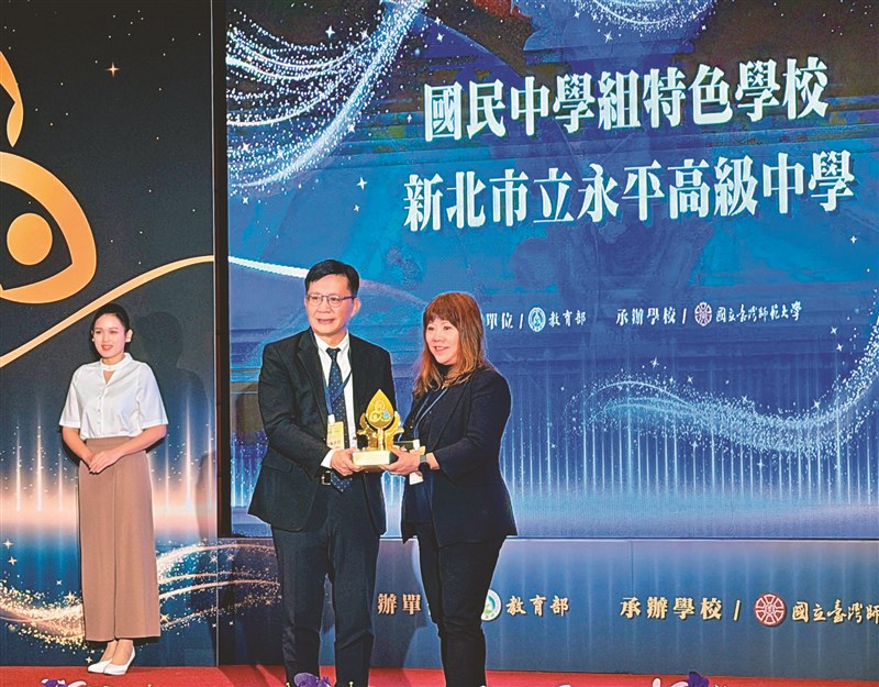 三好校園實踐學校新北永平高中,今年獲選教育部品德教育特色學校,昨日由教育部政務次長張廖萬堅(中)頒獎給校長沈美華(右)。圖/記者張穎容