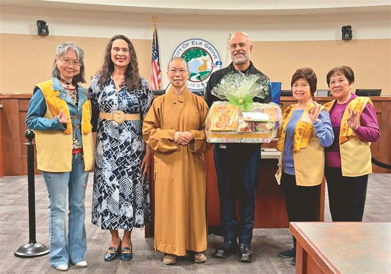 佛光山菩提寺敦親睦鄰,妙涵法師(左3)偕信眾拜訪Elk Grove市長Bobbie Singh-Allen(左2)、警察局長Bobby Davis(右三),眾人在市議會廳合影。圖/佛光山菩提寺提供