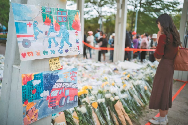 大批香港民眾昨天自發前往大埔宏福苑火災現場,在警戒線外排隊獻花,悼念火災罹難者。圖/中新社