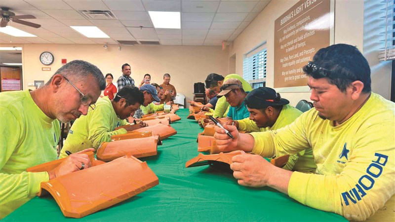 光明寺施工團隊認真思考,在琉璃瓦上寫下祝福或感想。圖/光明寺提供