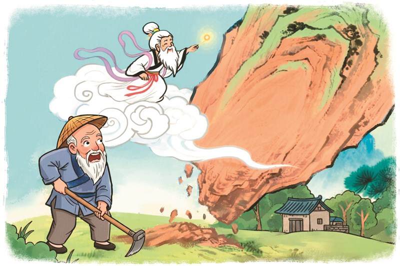 愚公聽了淡淡地說道:「這兩座山不會再長高了,但我死了以後,還有兒子和孫子,我的兒子和孫子死後,也還有他們的兒子和孫子,只要我們的子子孫孫一直努力鏟土、移山,終有一天必定可以順利完成這個目標的。」