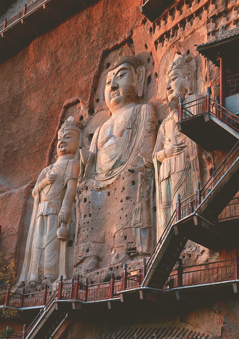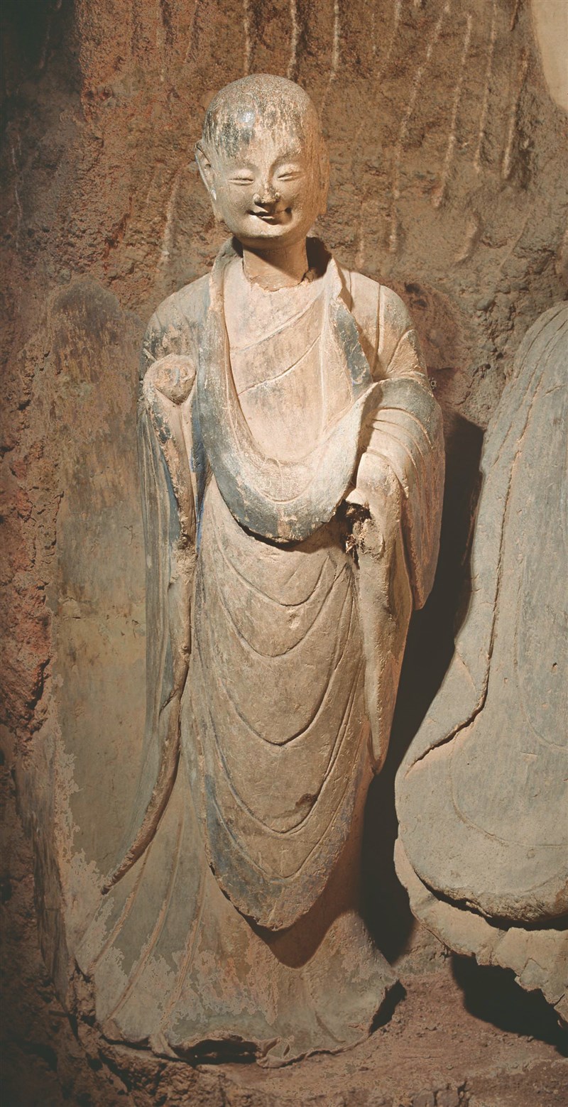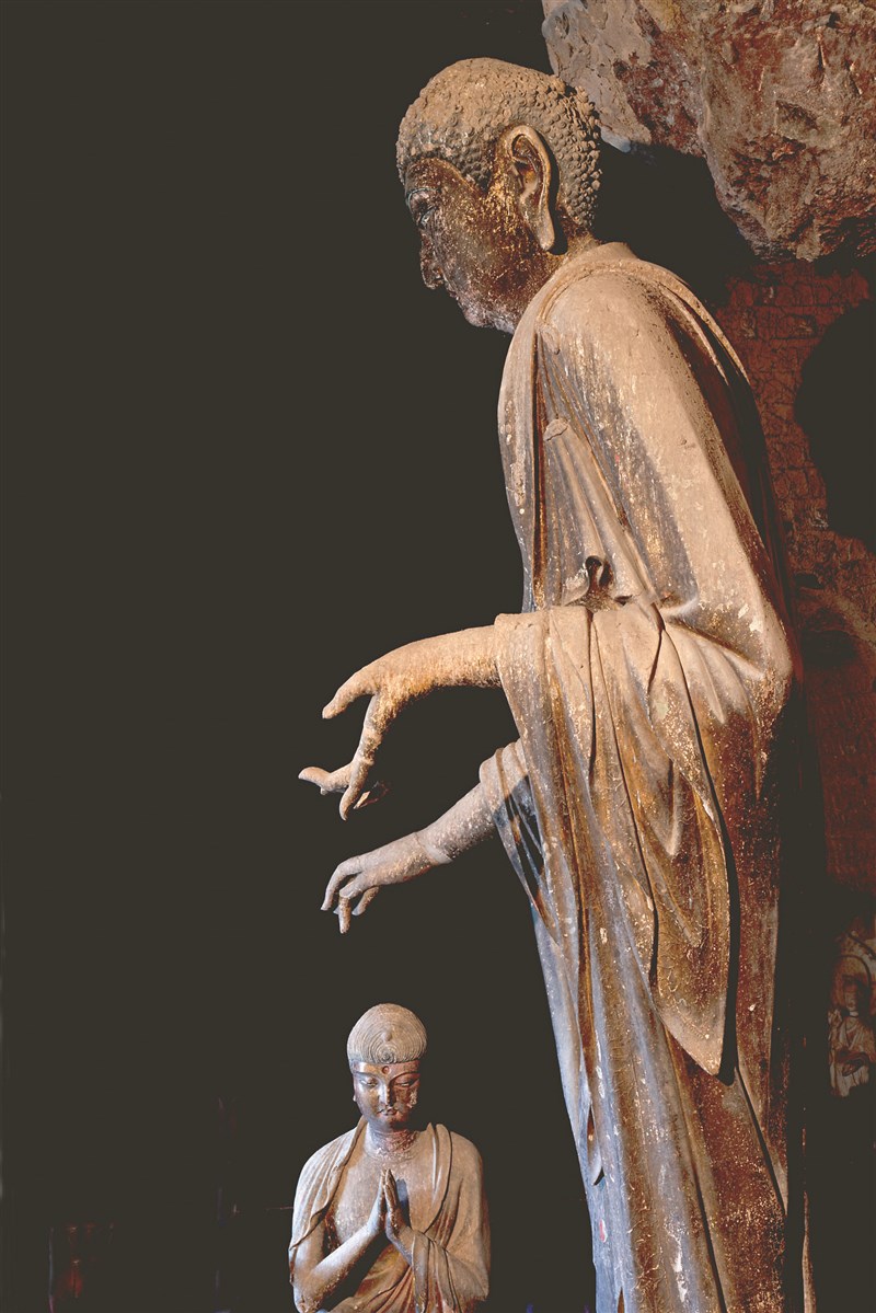 【東方微笑 跨越千年──麥積山石窟藝術特展】天工造境 絕壁佛國 文/麥積山石窟藝術研究所、佛光山佛陀紀念館 |2025.12.01 語音朗讀 37觀看次 字級 大 中 小 第13窟東崖大佛 圖/麥積山石窟藝術研究所、佛光山佛陀紀念館第133窟釋迦會子 圖/麥積山石窟藝術研究所、佛光山佛陀紀念館第133窟小沙彌立像 圖/麥積山石窟藝術研究所、佛光山佛陀紀念館麥積山石窟分布圖 圖/麥積山石窟藝術研究所、佛光山佛陀紀念館 文/麥積山石窟藝術研究所、佛光山佛陀紀念館世界文化遺產麥積山石窟位於甘肅天水,始鑿於十六國後秦,至北朝時期達到鼎盛,傳承至今一千六百餘年。「東方微笑 跨越千年──麥積山石窟藝術特展」12月13日將於佛陀紀念館盛大開展。展覽循跡麥積千年,分四單元呈現:「絲路明珠‧麥積奇觀」溯源傳承千年的信仰,解密為何在此險峰開鑿塑像;「天工造境‧絕壁佛國」展現古人於懸崖峭壁間的卓絕營建智慧與鬼斧神工技藝;「妙像丹青‧東方微笑」傾聚「東方雕塑陳列館」之精華,品鑑中國早期雕塑之瑰寶;「潛心護寶‧跨越千年」講述代代石窟人薪火相傳、賡續文脈的動人篇章。第133窟釋迦會子這組宋代造像由一大一小兩尊立佛組成,位於麥積山石窟西崖中部第133窟的進門正中。大佛(高約3.5公尺)身形偉岸,立於三重仰蓮瓣蓮台。頂飾螺紋髮髻,面龐方圓,眉形細長,眉間嵌白毫。雙目微啟俯視,左臂微屈收於身前,掌心向前;右手前伸,掌心向下。身著通體袈裟,衣緣以瀝粉堆金工藝裝飾蓮花、團雲紋及蓮葉。小立佛(高1.6公尺)位於大佛右前方,體量纖秀。頂梳漩渦紋髮髻,頭略低垂,雙目下斂,雙手合十。上身披袒右袈裟,衣緣同樣飾有瀝粉堆金紋樣。此組造像突破傳統佛像的肅穆範式,釋迦牟尼垂眸凝視羅睺羅,威儀中凝注初晤親子的悸動與悲憫。展期:2025年12月13日~2026年6月28日 時間:9:00~18:00地點:佛光山佛陀紀念館本館第一、第二展覽廳佛館官網:www.fgsbmc.org.tw 前一篇文章 【文學天地】話宋代傑出 女詞人李清照(下) 下一篇文章 【食說新語】色妍質甜燈籠椒 熱門新聞 01佛光山印度沙彌剃度 願復興印度佛教2025.11.2502【生活快門】小裝飾大創意2025.11.2503【遊藝筆記】 寒潭欲下遲2025.11.2504【遇見荷】雨滴的吟唱2025.11.2505中巴佛光康寧醫院 慶祝建院22周年2025.11.2506睡前滑手機熬夜追劇 糖尿病風險飆增67%2025.11.2507TPASS 2.0+ 長途客運北高最低42折2025.11.2508初冬銀杏正美2025.11.2509俄烏和平架構 美烏協商更新 2025.11.2510宿霧聖卡洛大學、佛光山 暢談翻譯與真理2025.11.25 訂閱電子報 台北市 天氣預報 台灣一週天氣預報 相關報導 【課本沒有的歷史】他們為什麼叫 「八路」【文化遺產】大足石刻博物館【野鳥紀事】台灣古典文學中的夜鷺詩意【大千我見──蔡梅芳、王玲琳、楊新福、冼宜泉藝術創作聯展】忘憂【寰宇采風】兩千年後的凝視──布魯日聖血聖殿【藏在剪紙中的故事】廟會記憶──點香