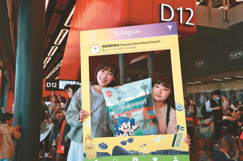 桃機第3航廈北登機廊廳昨起試營運,現場設有拍照打卡點。