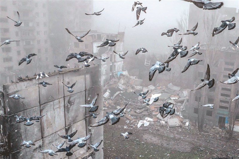 在烏克蘭前線城市康斯坦丁諾夫卡,一群鴿子11月28日飛過被戰火破壞的建築。圖/法新社
