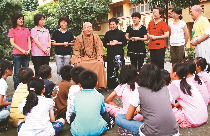 星雲大師早年為大慈育幼院院童講故事,時任院長的蕭碧涼師姑(右5)及其他資深教職員在一旁聆聽。圖/資料照片