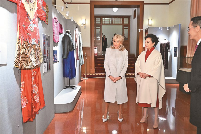 中國大陸國家主席習近平夫人彭麗媛(中),4日上午和法國第一夫人碧姬特羅尼厄(左),參觀北京人民藝術劇院。圖/新華社