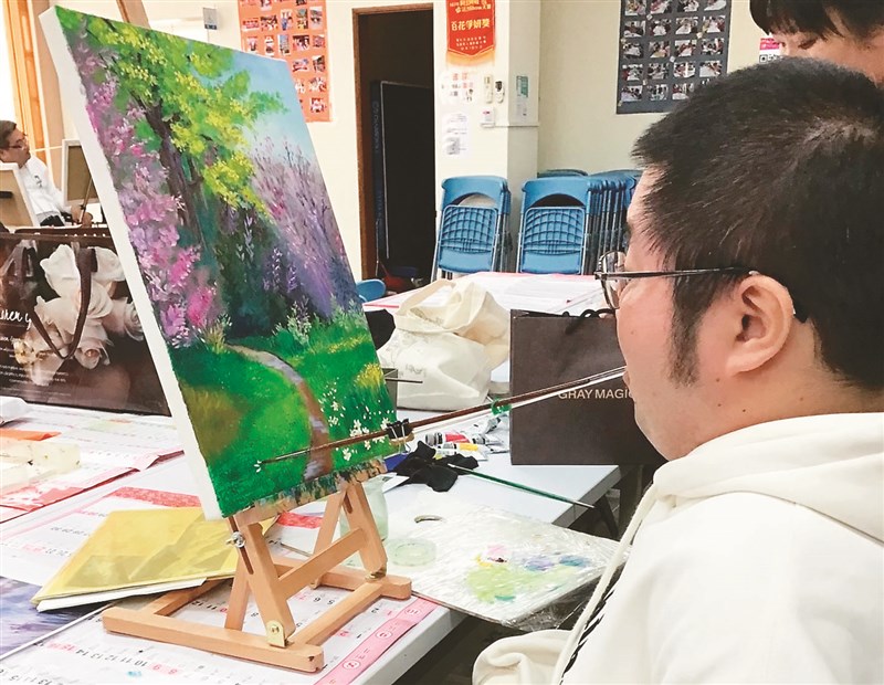 【記者王淑芬高雄報導】湛藍的天空、繽紛的花朵,層次細膩且充滿生命厚度的畫作出自脊髓肌肉萎縮症(簡稱SMA)病友沈永德之手;讓人動容的是罹病後,他的肌肉力量逐日流失、手腳到軀幹的控制能力也慢慢被剝奪,但他銜著筆以頭頸的力量展現開闊的生命視野。