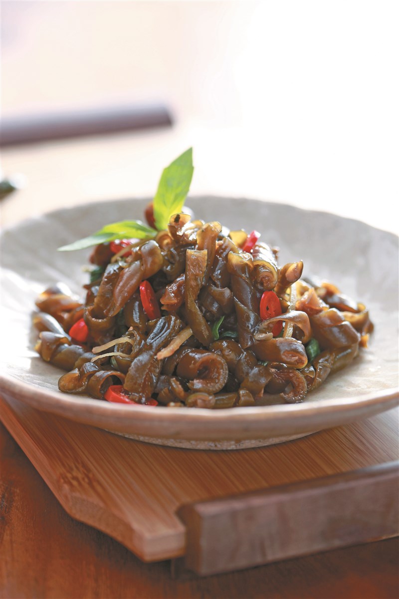 老薑0.5兩,洗淨後切絲;辣椒0.2兩,洗淨後切圓片;海茸半斤,洗淨切段;九層塔0.5兩,摘下葉子洗淨