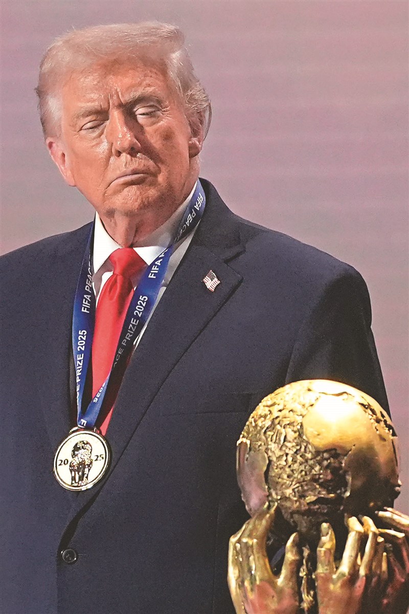 美國最新版國家安全戰略出爐,總統川普的外交哲學「唯利是圖」。圖為川普5日在2026年世界盃足球賽抽籤儀式上,領取國際足總頒發的和平獎。圖/美聯社