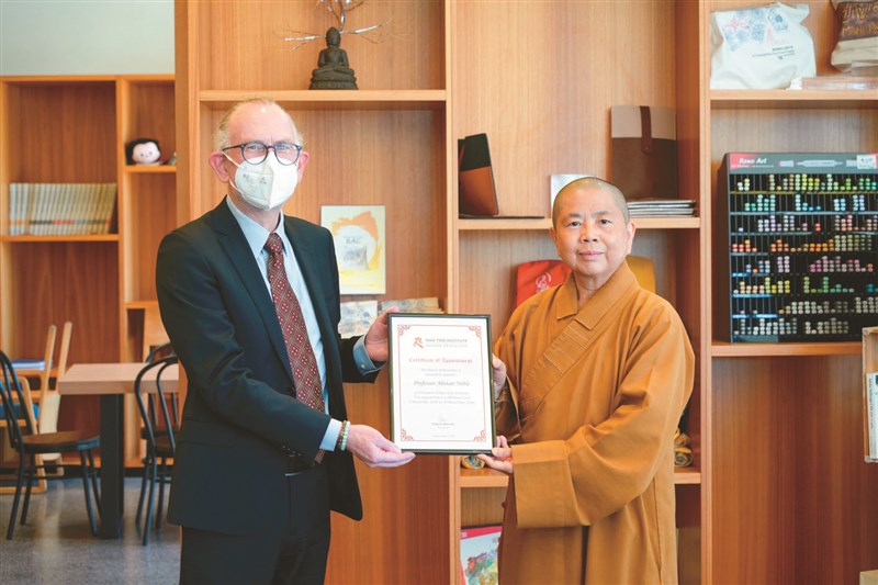 滿可法師(右)為新校長Alistair Noble教授(左),頒發聘任證書。