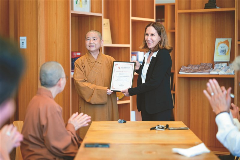 滿可法師(左)代表常住,頒發特製感謝狀予卸任校長Denise Kirkpatrick教授(右)。圖/人間社記者Sophie