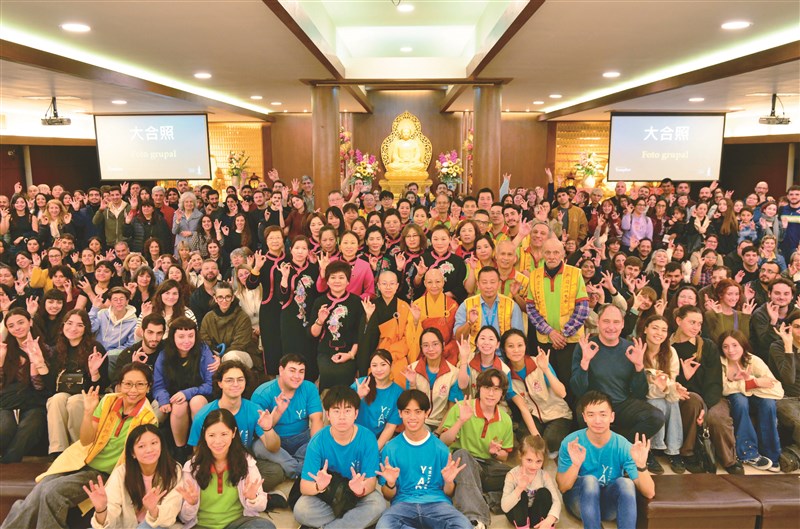 阿根廷佛光山響應布宜諾斯艾利斯市政府宗教局主辦的「寺院之夜」活動,安排多項課程迎賓。圖為住持妙遠法師(第3排穿紅祖衣者)偕佛光人,與參訪大眾合照。圖/阿根廷佛光山提供