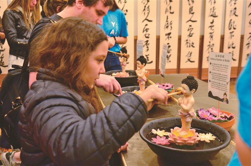 天空下著小雨,但澆不熄阿根廷民眾熱情的參與。晚間七時二十分已有近百人在門口撐傘等待,住持妙遠法師慈悲,提前半小時開放進場。參訪時間從晚上八時到凌晨十二時,國際佛光會阿根廷協會長林珊帶領百位義工幹部支援,集體創作。