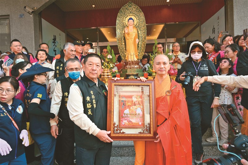 佛光山岡山講堂住持慧炬法師(右),代表接受白沙屯拱天宮常務監事黃駱晟贈送的匾額。圖/人間社記者蔡清華