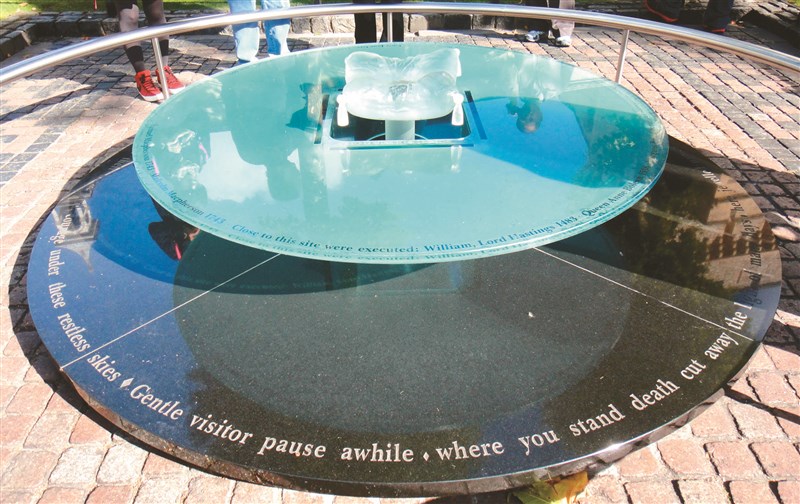 英國倫敦塔內,「塔綠地」(Tower Green)東北角偏中、緊鄰「聖彼得皇家禮拜堂」的正前方,矗立著一座透明的玻璃圓形紀念碑。環繞基座的銘文以詩意的語調刻下:「溫柔的訪客,請駐足片刻。你所站之處,死亡曾斬斷了無數生命的光輝……」