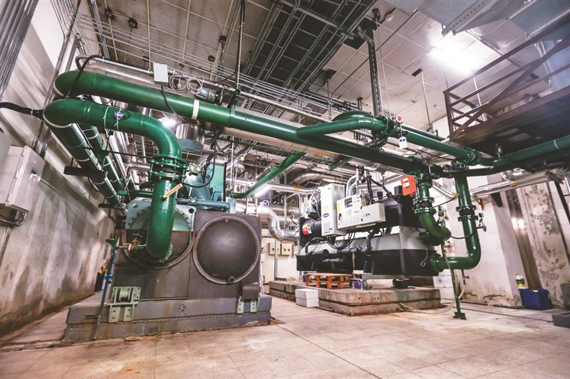 兩廳院地下有巨大空氣管道間,空氣進入地下管道消毒,以及冰水主機降溫後,再循環進場館裡。圖/曾原信