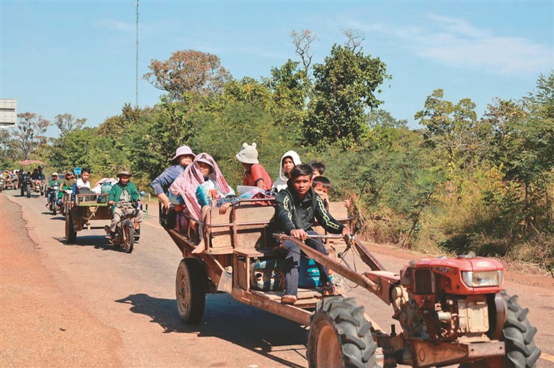泰柬衝突7日又起,柬埔寨居民8日在邊境地區普里維希省,坐上車輛準備撤離;圖由柬埔寨媒體「Agence Kampuchea Press」釋出。圖/美聯社