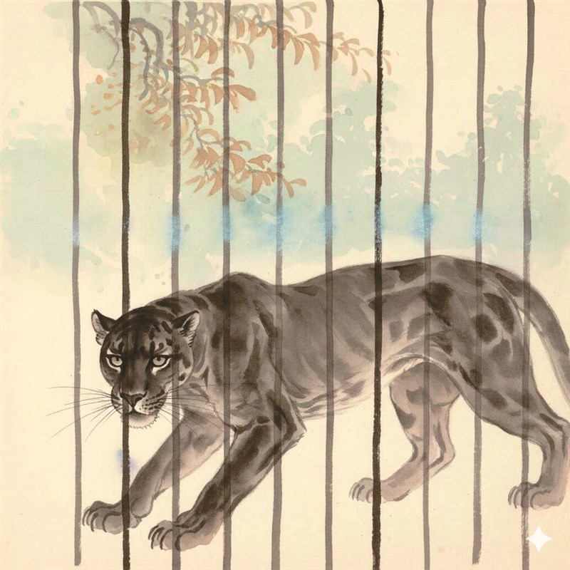 詩人里爾克身居巴黎期間寫就多篇「即物詩」,一九○三年完成的〈豹──在巴黎植物園〉堪稱其中代表作。所謂「即物詩」,是指客觀地細察、描述一個主體,透過與該主體的內在對話,讓它展現並表達出其存在之精髓。譯者馮曾說:「像羅丹從各方面仔細觀看一件物那樣,里爾克在巴黎植物園觀看那隻禁錮在鐵欄裡的豹,用了幾天的時間才寫出這首僅有十二行的詩。直到他逝世的那一年,還特別提到這首詩是在羅丹影響下『嚴格訓練的最初的成果』。」