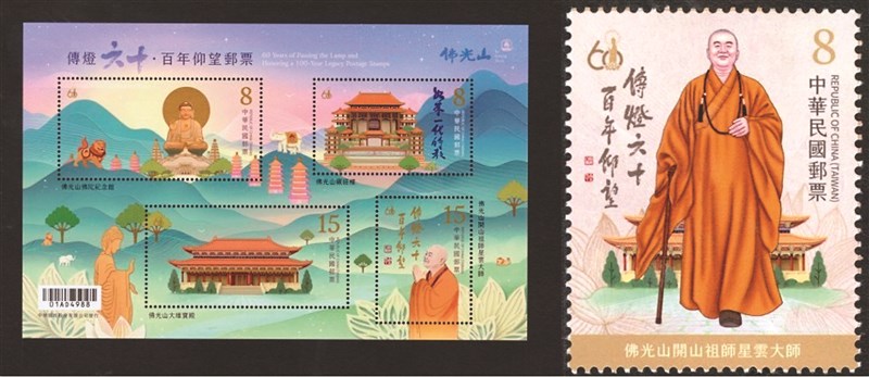 配合佛光山開山六十年暨星雲大師百歲誕辰,「傳燈六十.百年仰望郵票」特種郵票預定明年三月三日發行,含郵票一枚及小全張一張,郵票面值為八元,小全張內含面值八元及十五元郵票各兩枚。