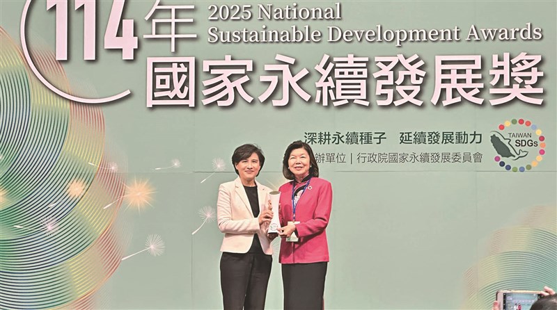 「114年度國家永續發展獎」8日於台大國際會議中心舉行,國際佛光會中華總會獲頒民間團體類獎項,由總會長潘維剛(右)代表受獎,頒獎人為行政院副院長鄭麗君。圖/國際佛光會中華總會提供