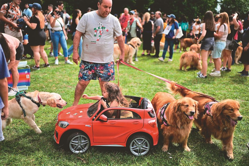 二千三百九十七隻黃金獵犬齊聚,一名小女孩和眼前的狗狗玩耍。圖/美聯社