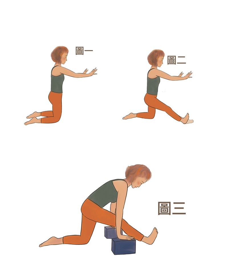 三、若想加深大腿後側的伸展,身體可前彎,雙手放在地上或瑜伽磚上,避免駝背(圖三)。