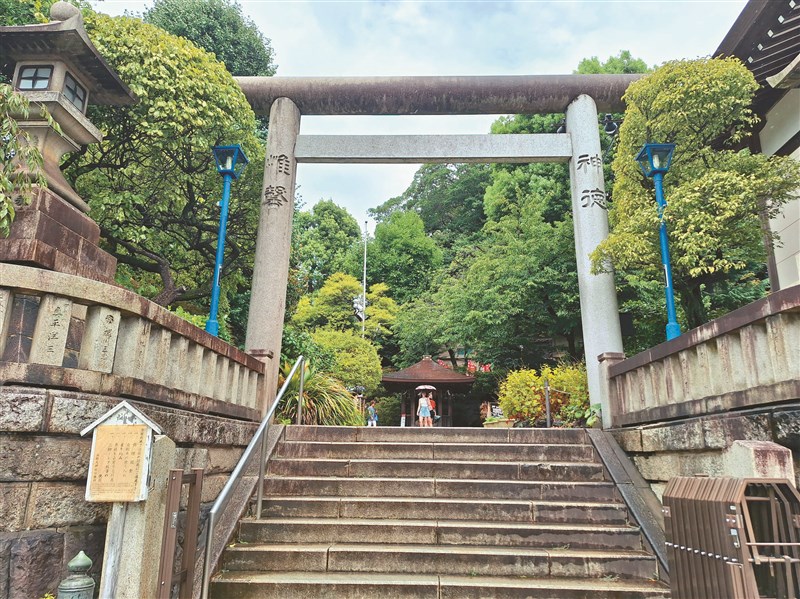 階梯盡頭是高大的石鳥居。圖/林孟慧