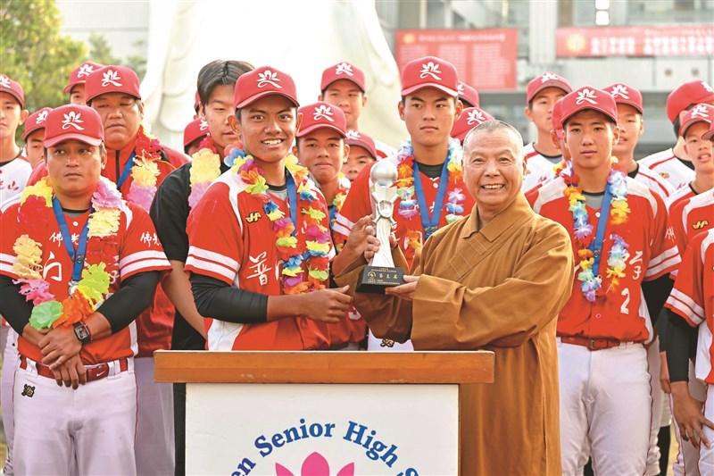 普門中學董事長慧傳法師(前排右),接受鋁棒聯賽隊長江陳廷偉(前排左)獻上季軍獎盃。圖/人間社記者慧裴