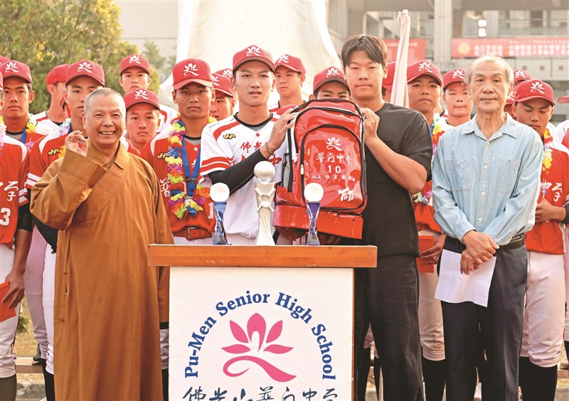 【人間社記者李生鳳大樹報導】佛光山普門中學棒球隊8日在114學年度高中棒球運動聯賽硬式鋁棒組榮獲季軍,10日於學校舉行獻獎,以及職棒校友、富邦悍將張育豪棒球後背包捐贈儀式。全校900名師生歡聲雷動,共同迎接充滿鼓舞和感謝的一刻。