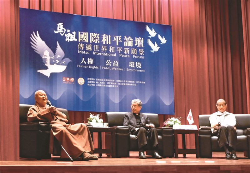 2011年,星雲大師(左)應馬祖國際和平論壇邀請,與天主教單國璽樞機主教(中)以及台灣紅十字會總會會長陳長文(右),就「公益與和平」主題進行探討與交流。圖/記者郭書宏