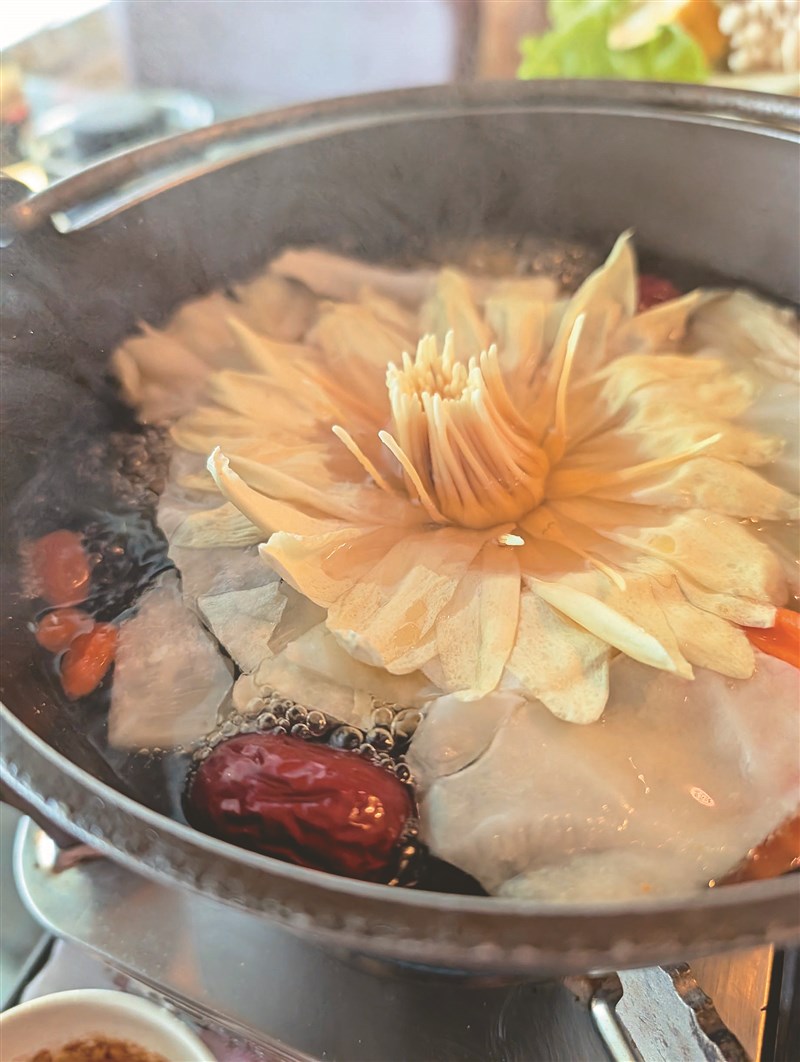 花瓣隨著熱氣舒展,姿態優雅,佐以紅棗枸杞燉煮,湯頭清甜甘潤,搭配新鮮的蔬菜—絲瓜、南瓜、豆皮、高麗菜、豆腐等配料,「啵啵啵……」隨著火鍋裊裊生煙,每嘗一口清香,心中多一分清淨。這一鍋,煮的不只是美味,更是純粹的心靈昇華。
