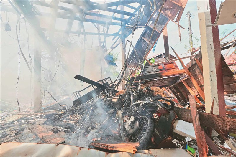 泰柬邊境衝突延燒,泰軍稱柬埔寨砲擊位邊境地區的泰國四色菊府,14日可見遇襲地區有房屋毀損。圖/美聯社