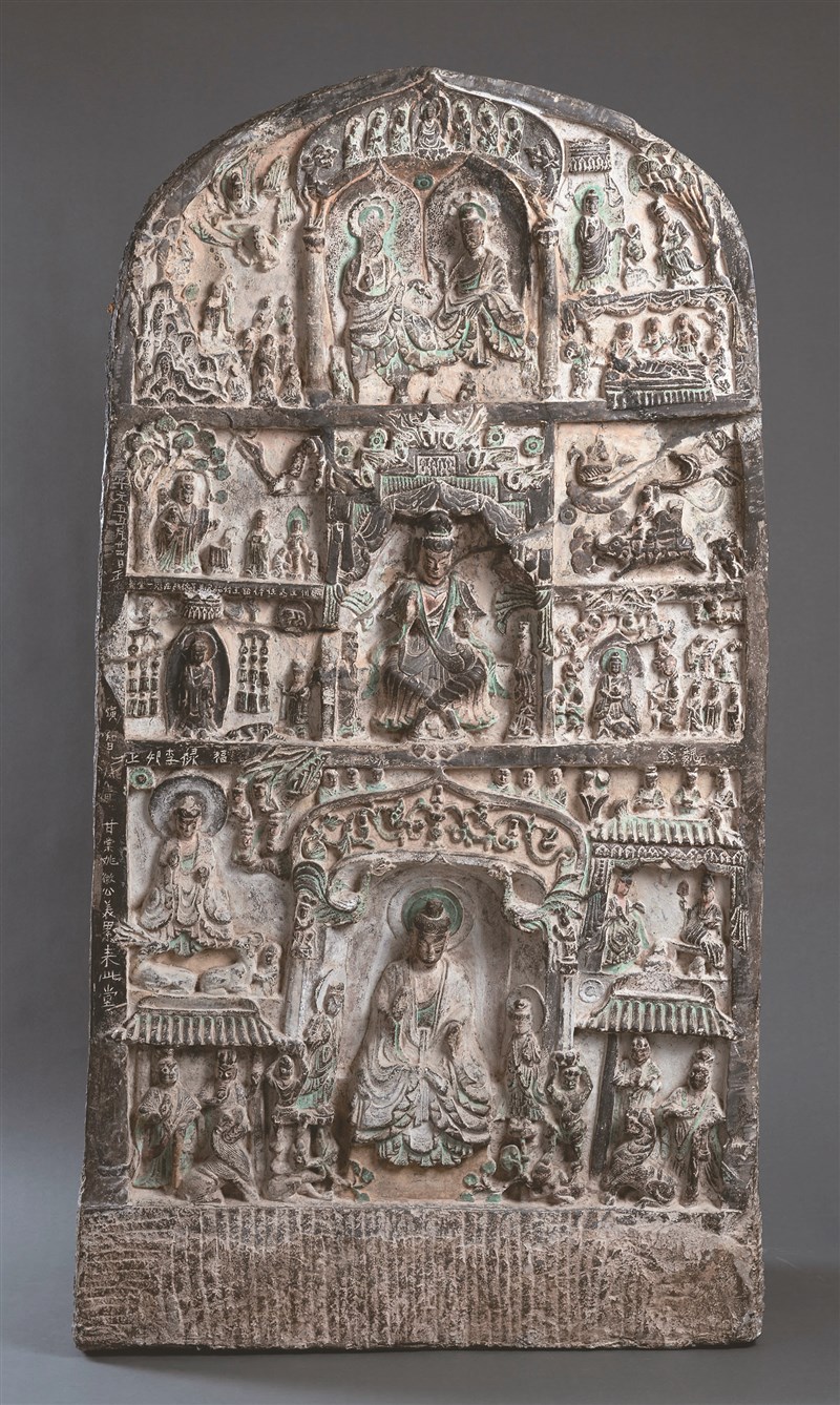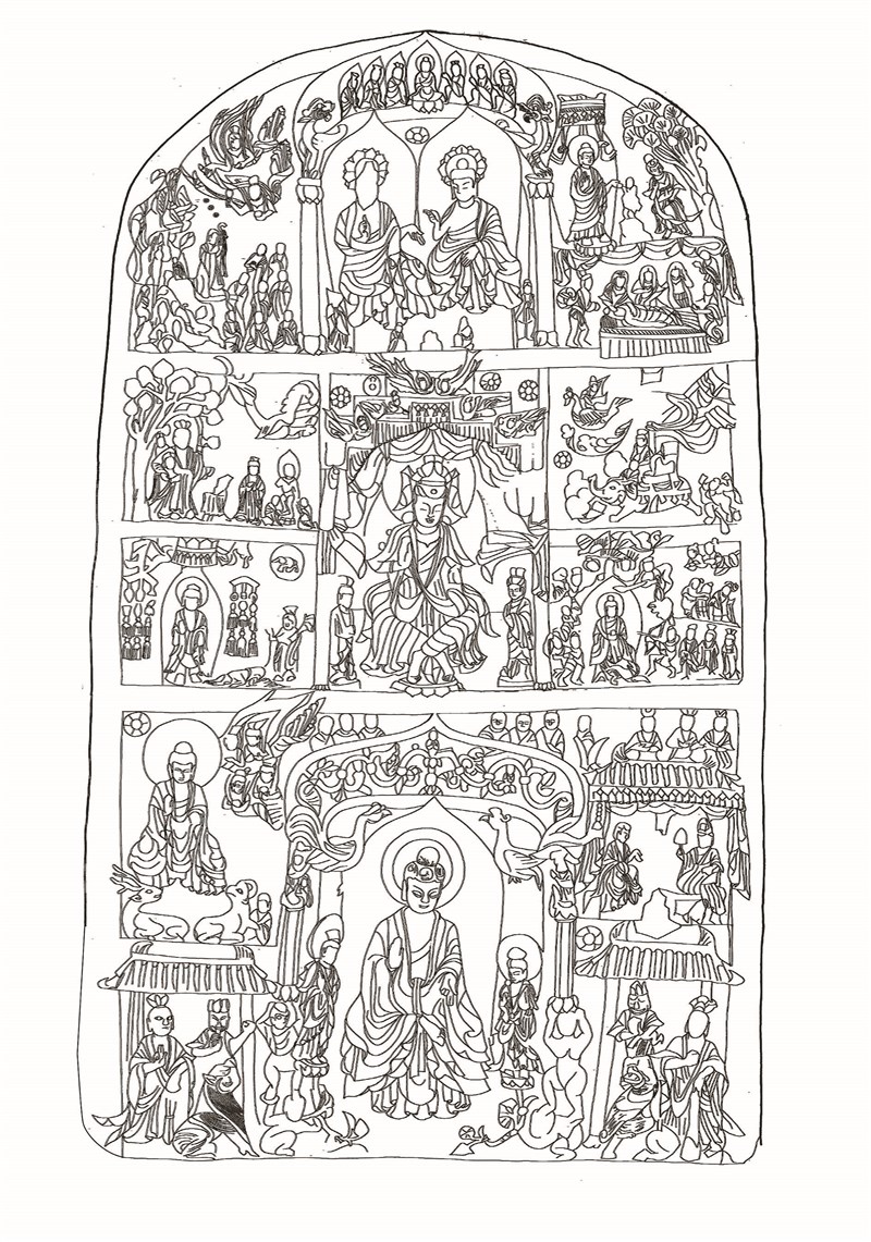 北魏‧第133窟,此造像碑位於第133窟東側後室中央,為花崗岩質長方形石碑,頂部作圓拱形。碑身採用三段式構圖,從上至下、由左及右,在14個界格內雕刻12組佛傳故事與經變題材,呈現人物百餘身。全碑以釋迦牟尼佛於忉利天發願為核心,自燃燈授記始,至娑羅林涅槃終,生動濃縮佛陀一生軌跡,堪稱中國早期石刻連環畫之典範。