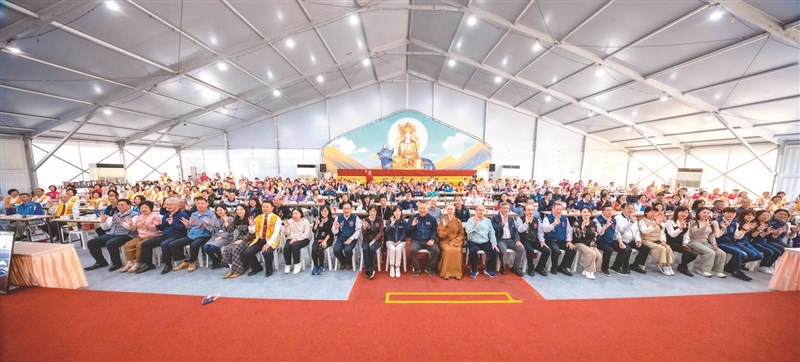 佛光山桃園講堂「區里長接心懇談會」,11日在文中路新弘法基地舉行。圖為住持覺元法師(前排左14)與桃園市府及地方區里代表逾400人合影。圖/人間社記者王英斌