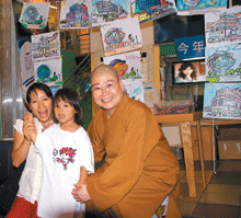 (圖說:媽媽捐獻送愛到四川,三歲小朋友Lotus開心穿上認購的奧運T恤,並與永固法師合照。人間社記者Emily攝)
