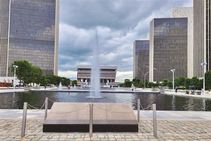 圍繞著紐約州首府奧爾巴尼市區(Albany)地標、現代主義建築理念構造的長方形帝國廣場,慢走一圈。中間寬闊噴水池不斷往上噴出迷濛水氣,其旁矗立四棟同款優美辦公大樓,高聳的埃拉斯特斯康寧大廈(Erastus Corning II tower),司法、立法大樓,還有巨蛋劇場(The Egg),空間就是科技權力的展現,整個建築的宏偉華麗現代感,讓人嘆為觀止。