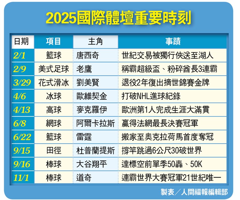 日球星率道奇連霸 2025體壇最驚奇 文/記者張哲郢專題報導 |2025.12.19 語音朗讀 44觀看次 字級 大 中 小 圖/美聯社圖/美聯社洛杉磯道奇隊11月贏得今年世界大賽第7戰勝利,成為大聯盟近25年來首支2連霸球隊,山本由伸(前排右4)和大谷翔平(前排右6)表現尤其亮眼。圖/法新社2025國際體壇重要時刻 製表/人間福報編輯部圖/美聯社圖/美聯社 文/記者張哲郢專題報導2025年即將進入尾聲,今年度國際體壇上多個重要事件,從北美四大職業聯盟到歐洲體壇,其中又以MLB美國職棒洛杉磯道奇與大谷翔平、山本由伸等日籍球星所譜出的一連串驚奇最為震撼,道奇隊也在這過程完成本世紀唯一大賽連霸。在今年的道奇隊之前,從來沒有任何冠軍隊伍可以在21世紀連2年奪冠,而道奇雖然被看好有機會連霸,卻因為牛棚問題一度被看衰。回溯國聯冠軍賽,大谷繳出堪稱史上最出色的單場表現,以二刀流身分先發登板6局10K無失分,並用球棒貢獻單場三響砲,一己之力把球隊帶進世界大賽。世界大賽道奇跟多倫多藍鳥進行史詩般7場大戰,雙方在第3戰更是歷經18局大戰才由道奇驚險勝出,不過打完前5戰,卻是藍鳥率先在系列賽取得聽牌。眼看藍鳥要拿下自1993年後首次世界大賽冠軍,拯救道奇的救世主降臨,山本由伸一肩扛起壓力,在第6戰先發6局僅丟1分奪勝,驟死戰更是在沒有休息天數下登板救援,2.2局無失分強勢守住領先,讓延長賽藍鳥無法突破僵局,道奇因此封王,山本在系列賽豪奪3勝包含1場完投勝,獲選世界大賽MVP。今年的道奇不只是成功衛冕而已,對棒球界來說,更是重新定義日本球員在棒壇的影響力;對外界而言,再次認識到棒球劇本有多不可思議。重拾二刀流 大谷依舊猛■這幾年MLB美國職棒話題總離不開洛杉磯道奇看板球星大谷翔平,而他厲害之處在於,每當寫下前無古人成就後,又總能再次刷新棒球三觀,今年他恢復二刀流身手,再度繳出史詩般的成績,讓他的旋風持續影響到全世界。去年大谷完成單季「50轟、50盜」已經夠誇張,他今年再次刷新自己單季全壘打以及道奇隊史紀錄,單季55轟表現,不只是連2季50轟,加上他投球端在47局送出62次三振,成為史上第1位單季「50轟、50K」的球員。季後大谷再次抱回MVP殊榮,5年間4度獲獎,4度都是全票MVP,各種指標、數據都顯示他無疑是當今世上最偉大的棒球員。麥克羅伊 高球生涯大滿貫達陣■今年相信對北愛爾蘭高球名將麥克羅伊(Rory McIlroy)是永生難忘,距離他上次奪得高球四大賽冠軍已經足足等11年,今年4月的名人賽,他在加賽擊敗英格蘭好手羅斯(Justin Rose),完成最後一塊拼圖,湊齊四大賽冠軍,生涯大滿貫締造歐洲歷史。過去高球界共有5名球員完成生涯大滿貫,上次有球員達成已經是2000年美國傳奇老虎伍茲(Tiger Woods),唯一非美國球員完成這紀錄則是南非普雷爾(Gary Player)。麥克羅伊先是2011年率先搶下美國公開賽冠軍,2012年在PGA錦標賽封王,直到2014年英國公開賽奪冠後,最後的名人賽綠夾克始終無法披上,直到今年他終於圓夢,成為第6位完成生涯大滿貫的選手。法網5.5小時對決 阿爾卡拉斯勝辛納■告別過去「三巨頭」世代,網球界男單現今成為義大利辛納(Jannik Sinner)以及阿爾卡拉斯(Carlos Alcaraz)的雙人武林,今年4大賽兩人再次各抱走2冠,當中法國網球公開賽的5盤大戰,更是堪稱留名青史的戰役。這場法網男單冠軍戰,阿爾卡拉斯跟辛納不只打好打滿,過程中3度進入搶七,在這之前,辛納只要闖進大滿貫賽決賽從沒輸過。經過5小時29分馬拉松大戰,阿爾卡拉斯成為史上首位讓辛納在大滿貫決賽敗陣的球員,不只完成法網衛冕,還打破賽會有史以來最長決賽紀錄。NHL歐維契金 躍新科進球王■NHL職業冰球今年誕生新科進球王,效力華盛頓首都的王牌歐維契金(Alex Ovechkin),在4月時以第895顆進球,躍上NHL進球榜第1,超越加拿大傳奇「冰球大帝」葛瑞斯基(Wayne Gretzky)。葛瑞斯基1999年退役前總計894顆進球,這紀錄來到21世紀也懸掛許久,直到在俄羅斯有著百年難得一見天才歐維契金的出現,在今年4月6日以第895球打破這紀錄,獨居史上第1。已經40歲的歐維契金至今依舊活躍在賽場上,11月5日他攻入生涯第900球,將NHL進球障礙再次堆高至新境界,不久後11月17日他則打破單一球場最多進球紀錄,細數無數成就儼然已是NHL史上最偉大進球高手。NBA詹皇、唐西奇 跨世代連線■NBA美國職籃今年初來自洛杉磯湖人與達拉斯獨行俠的交易,堪稱今年體壇最震撼,獨行俠把當家球星唐西奇(Luka Doncic)送往湖人,讓球迷一圓看見他與詹姆斯(LeBron James)聯手的畫面。今年詹姆斯帶著40歲高齡,照樣馳騁賽場,並成為NBA史上第1位例行賽、季後賽總得分突破5萬分的球員。原以為會在達拉斯度過一生的唐西奇,成為湖人今年最大收穫,他的加入讓這2位前後任全能球星聯手,成為NBA炙手可熱的話題,2人經過上半年磨合後,新賽季讓湖人成為不可小覷的強權之一,瞄準重返紫金榮耀。劉美賢復出 花滑世錦賽稱后■華裔美籍花式滑冰選手劉美賢,2022年生涯正要綻放時,在年僅16歲便宣布退休,不過在2024-25賽季她強勢復出,更在3月世界花式滑冰錦標賽中封后,留下屬於自己的激勵故事。16歲那年,劉美賢是冬季奧運美國陣中最年輕選手,但她自認生涯已經滿足,因此宣布退休想要嘗試其他領域;後續碰觸到滑雪,讓她再次感覺到滑冰的激情,短暫退役後再次復出。回到賽場上的劉美賢身手不退反進,世錦賽長、
