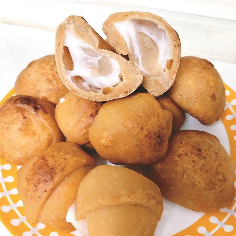 取一大鋼盆,加入5g乾酵母以少許溫水融化後,拌入400g高筋麵粉、100g糯米粉、100g地瓜泥,視黏手程度慢慢加入100ml冷水,順時針方式反覆折疊壓揉成有彈性、不沾盆與手的光滑麵團,置於盆中覆蓋靜置發酵約1小時後,稍滾圓整型排出空氣、分切成10份三角形狀。